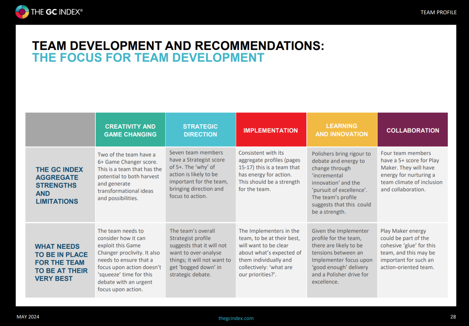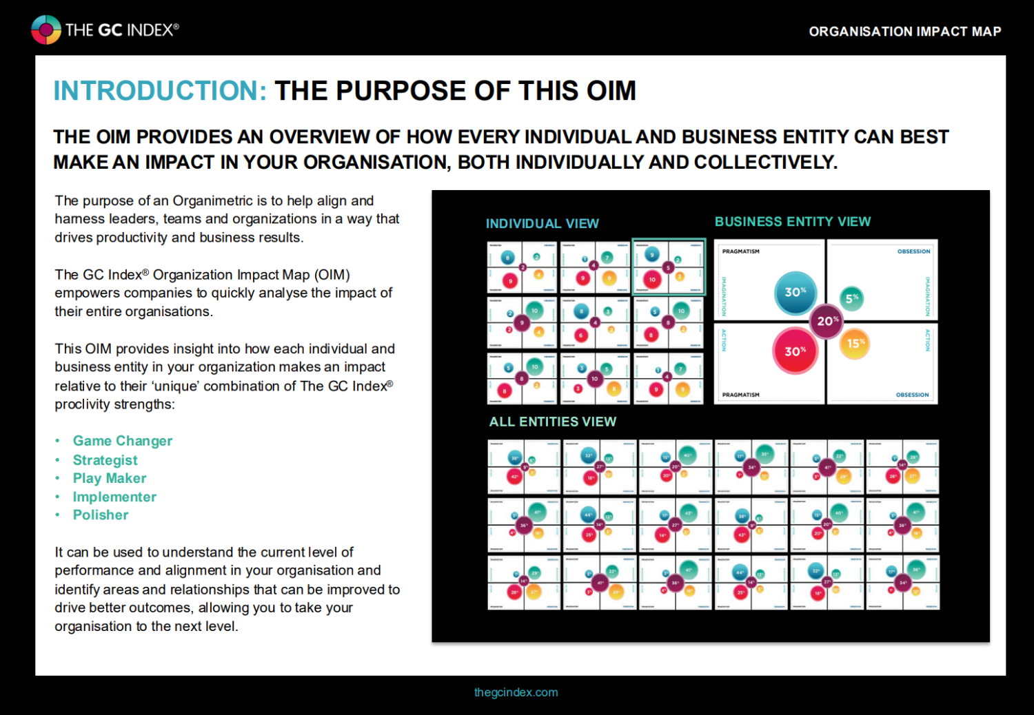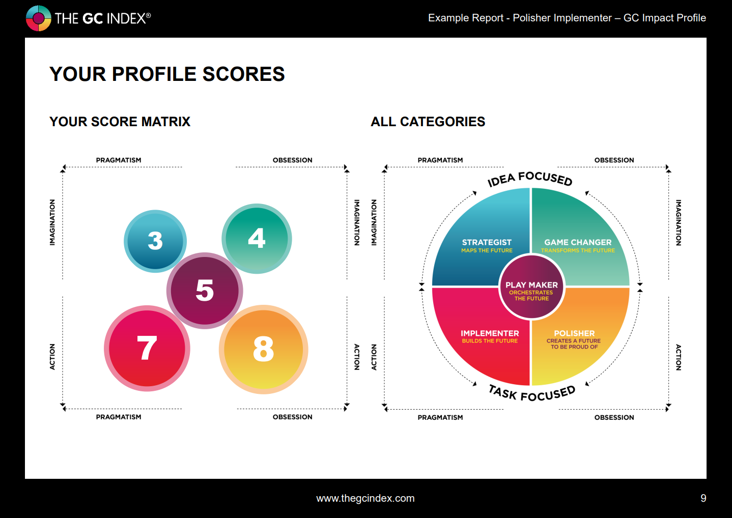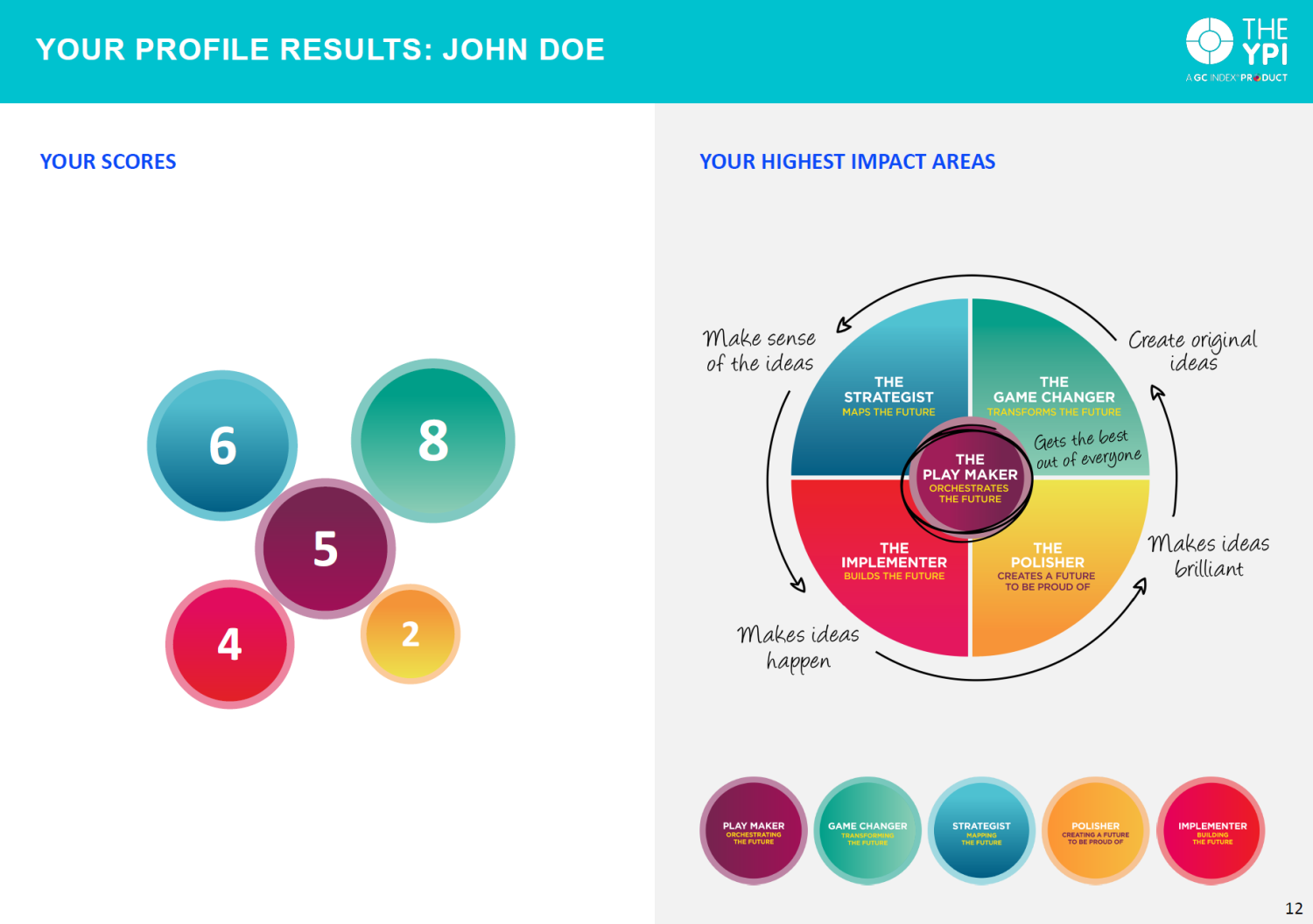 The original and core GC Index product. This serves as the foundation for self-awareness and other-awareness. It provides insights into an individual's energy for impact across the five GC Index proclivities: Play Maker, Game Changer, Strategist, Implementer, and Polisher. Each proclivity reflects a different way of contributing to a role, team, or organisation.