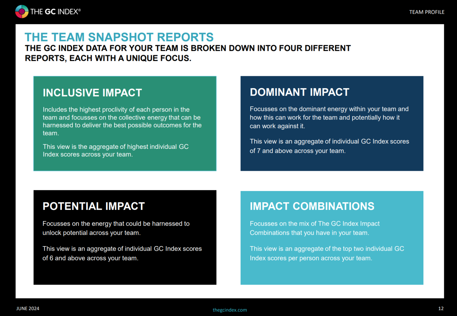 Impact Driven: Team Snapshot Lite starts discussions about team dynamics and energy distribution. Typically, a team will then move on to provide individual GC Index reports for each member, enabling a deeper dive into individual and collective impact.