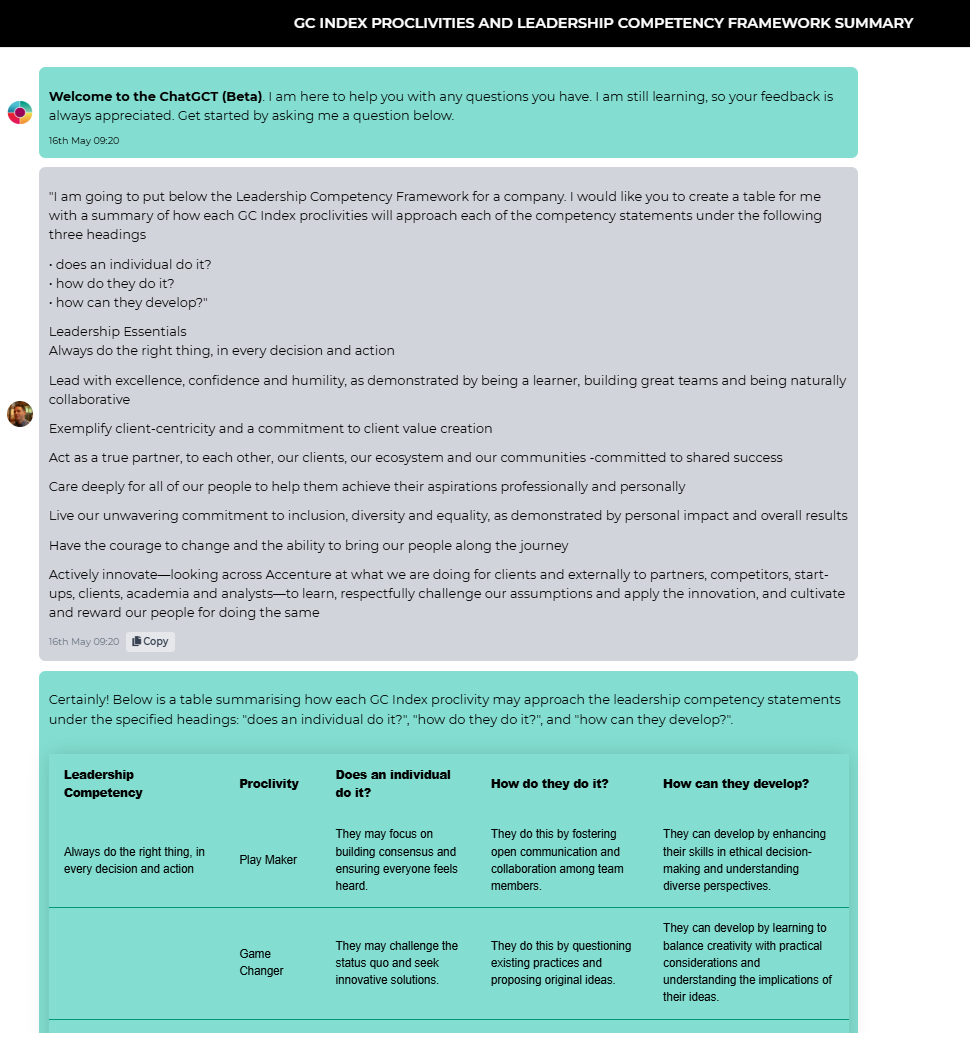 Impact Driven: ChatGCT provides timely assistance, helping individuals and teams explore ideas and resources that align with their energy for impact. It can facilitate brainstorming, suggest tips for working with others, and offer guidance on how to use GC Index tools effectively.