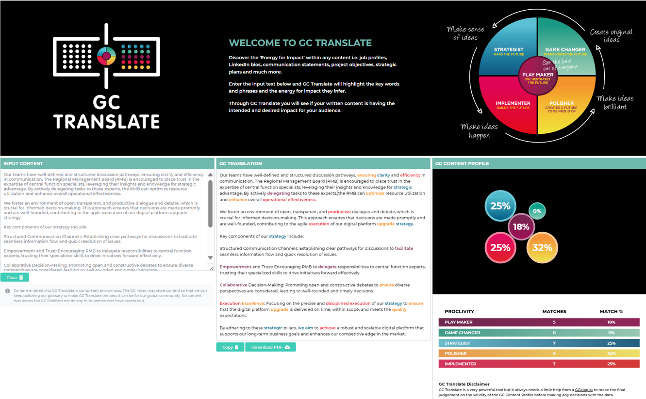 The clue is in its name! GC Translate, 'translates' any written content into GC Index language to highlight if that content is written with the intended impact.